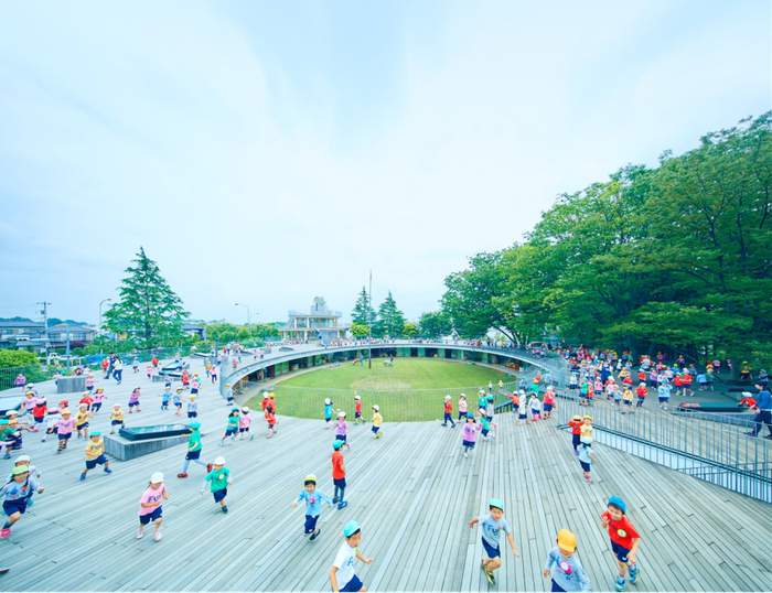 藤幼儿园的建筑是只有一层的环形结构,大家喜欢称其为“甜甜圈”。屋顶可供孩子奔跑、玩耍,天气好的时候还可以被当作教室。而屋顶上有两棵可以让孩子们爬上爬下的大树,还设有滑梯。每个人小时候的梦想,都在这里变成现实。
