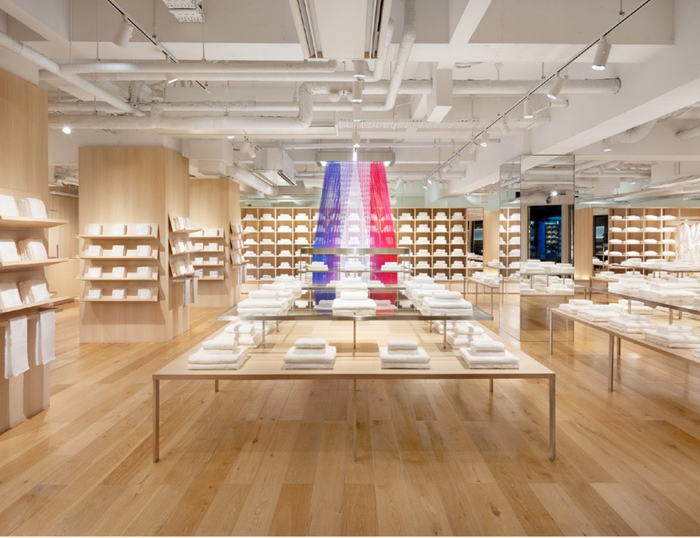 比如今治毛巾旗舰店,中间可以看到向下连接的三色线,模仿毛巾织机的形式,基于今治毛巾工厂的概念创造出标志性的旗舰店。