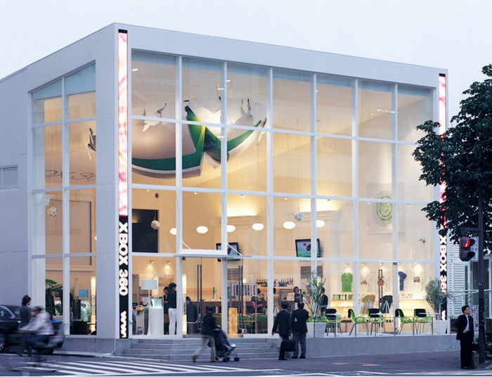 游戏机Xbox在日本推出时,运营了一家快闪店,我在设计这个建筑的时候,也是奉行建筑=标志的理念,天花板上的Xbox商标像是从美国或者说从宇宙飞到日本的不明飞行物。运营的一个月期间,成为大家纷纷打卡拍照的网红店。