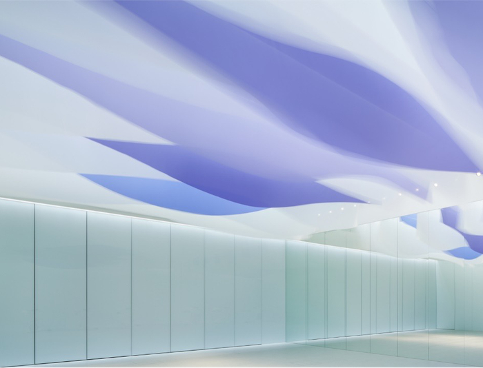 东京工作室的天花板就是基于logo设计,用的是布,特别到任何人一眼就能看出这是Beauty Experience的工作室,无论是邀请美容师进行活动、举行新产品发布会,还是入职仪式等等,大家都能一眼认出Beauty Experience。