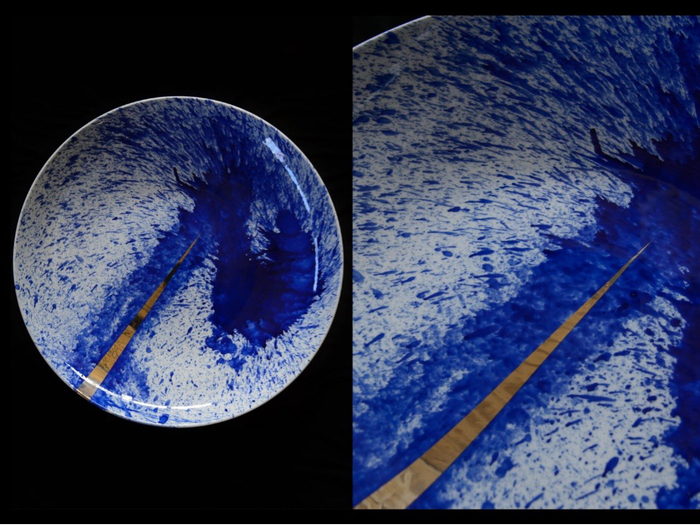 我想到泼墨画的方法,在纯白色瓷器上运用有田独特的蓝色岩石颜料。与以往的精致描摹完全不同,我的笔没有碰到瓷器,而是让自然的能量可视化,把颜料泼洒在上面,画就完成了。