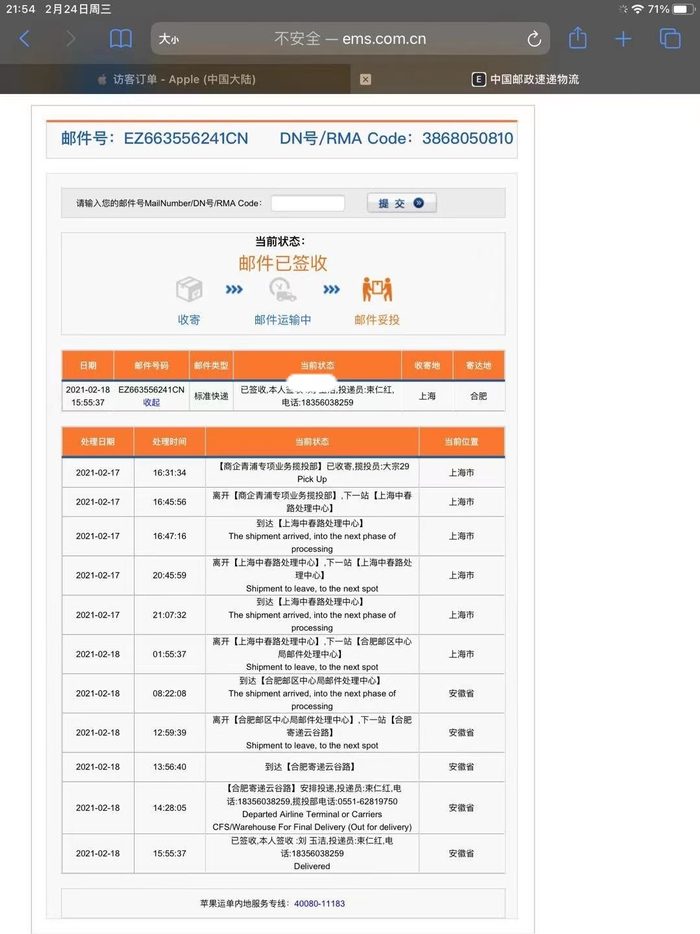 而在物流环节,刘女士提供的邮件记录显示,2月17日16点31分,刘女士的快递已收寄,位置为“上海”。2月18日8点22分,到达合肥邮区中心局邮件处理中心,14点28分,合肥寄递云谷路安排投递,15点55分显示“已签收”。