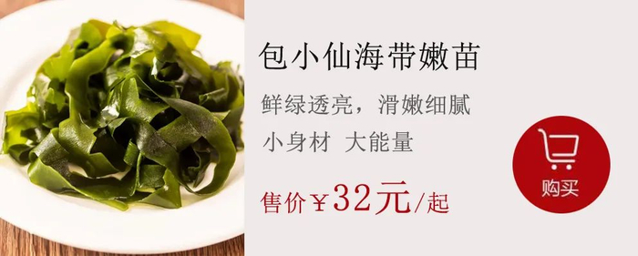 今天我们给大家推荐的是包小仙的海带嫩苗,原料产自“中国海带之乡”福建霞浦,远离污染的自然海域,海域营养物质高,得天独厚的自然环境才能生长叶厚肥美、色入翡翠的海带嫩苗。