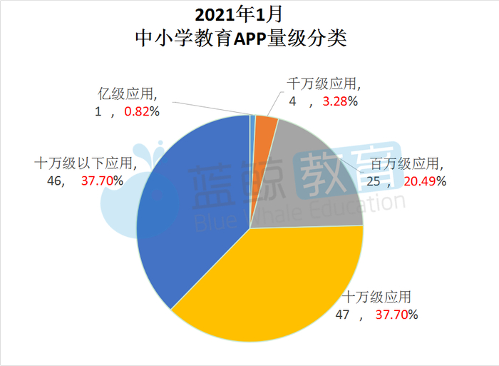 蓝鲸教育智库把122家中小学教育APP,按照用户规模,分别以1亿、1000万、100万、10万为界限做量级分类,得到的结果如下图所示:
