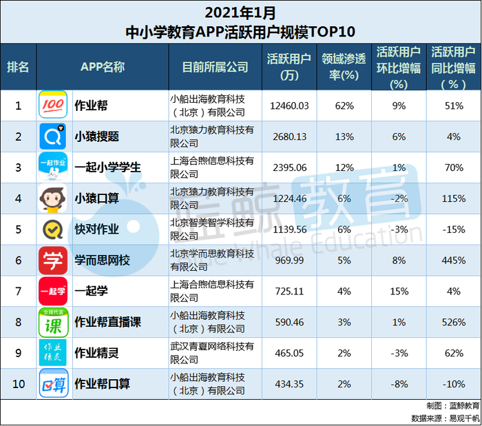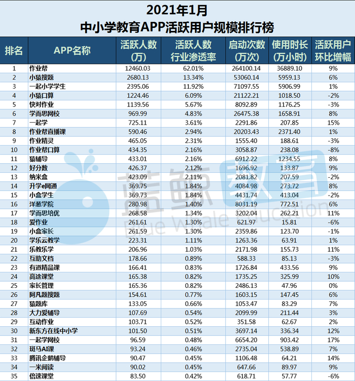 活跃用户TOP 10榜并无企业出入,且位次较2020年12月末并未发生改变。该榜中,涨幅最大的APP是“一起学”,环比上涨15%,月活跃人数725.11万。降幅最大的企业是“作业帮口算”,环比下滑8%,月活跃人数为434.35万。