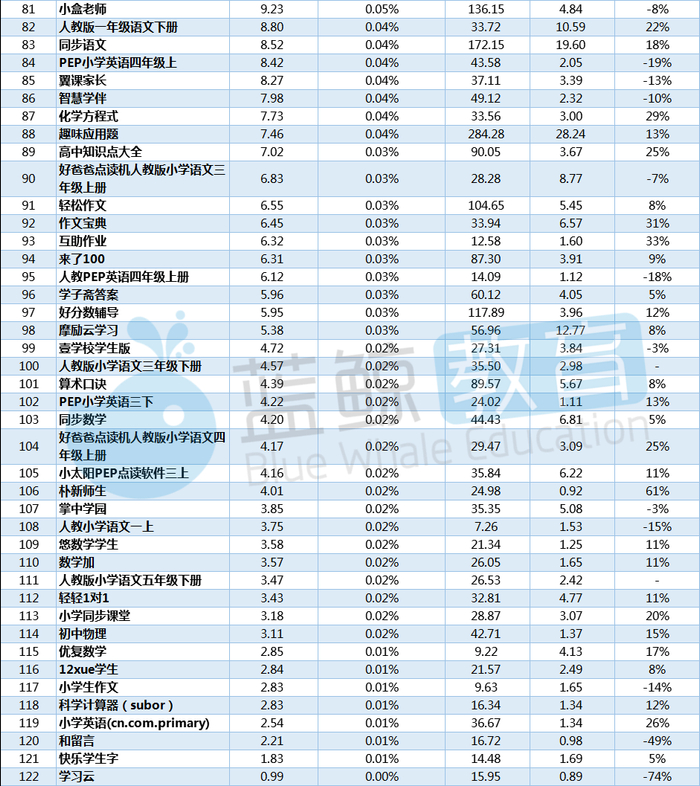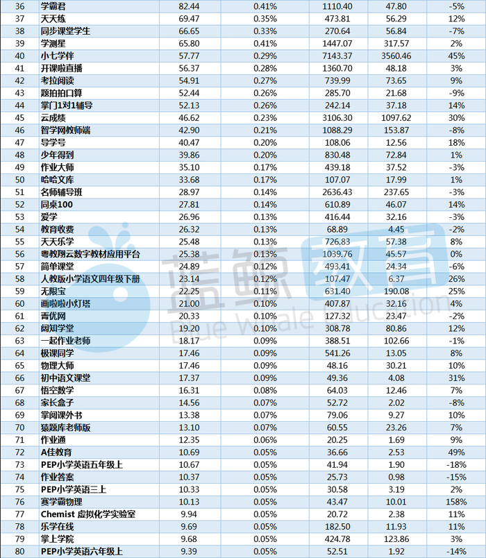 从该榜可以看出,亿级应用与千万级应用并未发生变化;百万级新增的应用是“新东方在线中小学”(上图已标红);十万级应用新增两家企业,分别是:“A佳教育”和“赛学霸物理”(上图已标红);“PEP小学英语六年级上”“小盒老师”“PEP小学英语四年级上”(图中标灰的APP)则从十万级应用跌出,成为十万级以下应用。
