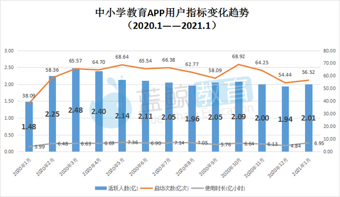 从上图可以看出,中小学教育赛道在2020年第一季度时接连上升,在2020年3月末时达到流量顶峰,用户规模2.48亿,之后便经历了连续数月的下降,并长期处在发展较为平缓的阶段。2021年1月末活跃用户2.01亿次,使用时长和启动次数较2020年12月末均有明显上涨。