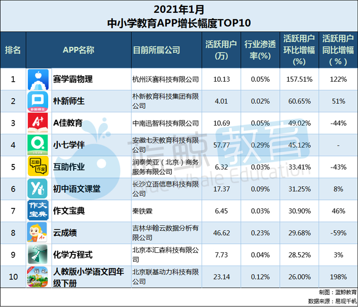我们再来看看,中小学教育领域用户增长幅度TOP 10的APP,2021年1月末活跃用户环比增幅TOP 10榜单如下(个别APP无2019年同期数据,故标为“-”):