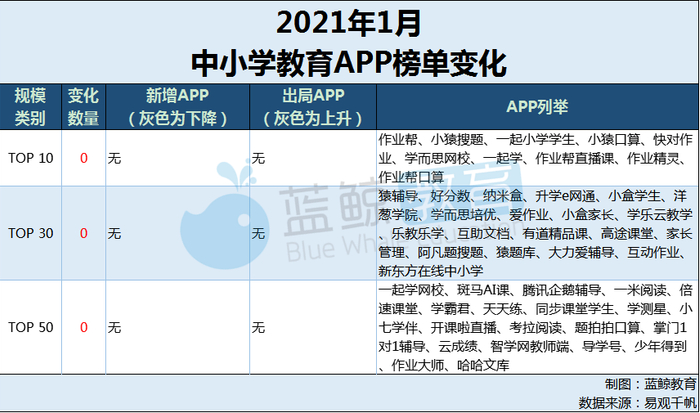 为了更好的梳理2021年1月末中小学教育学习赛道具体的APP数据变化,蓝鲸教育智库选取了2020年12月末到2021年1月末,中小学教育APP的具体榜单变化,下图是“2021年1月中小学教育APP榜单变化”:标灰色的APP表示从上一级别甩出到下一级别或者从下一级别进入上一级别,并不算作该级别新增APP;标红的为2020年12月各大TOP排行榜等级上升的APP: