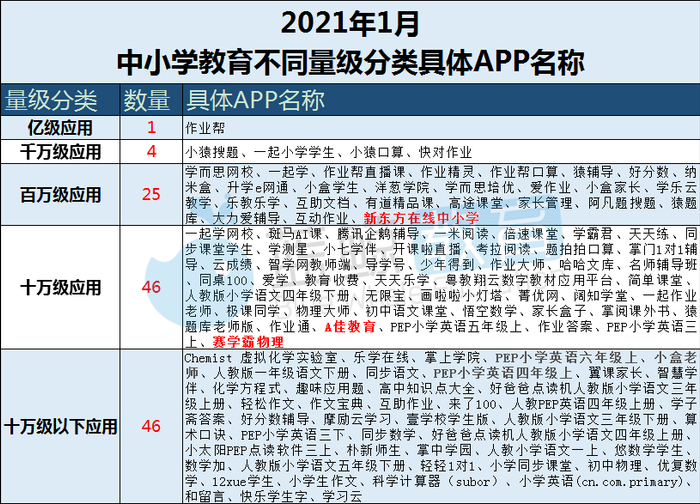 下面是2021年1月末122家中小学教育活跃APP的详细排名,排名按照用户规模,包括活跃人数、启动次数及使用时长等维度数据,供大家查阅: