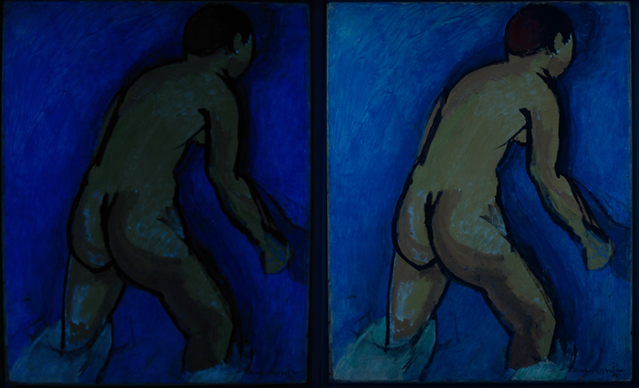 左:紫外线下的《浴者》;右:红外摄像头下的《浴者》