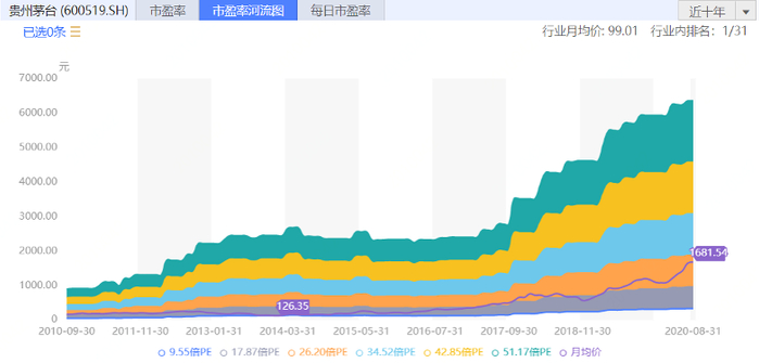 以市盈率河流图为例,如下方所示,该图表展示一段时间内股价相对于历史市盈率的走势。帮助投资者观察每股净利润的成长趋势,进而判断股价处于过去这段时间内的高/中/低位。