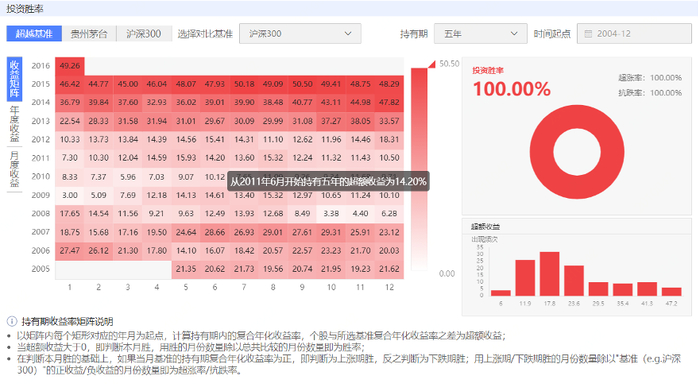 投资胜率指标,以收益矩阵可视化的方式帮助投资者了解个股的长期投资业绩: