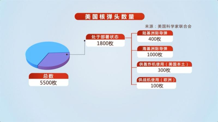美国智库本月初公布的最新推测数据显示:目前,美国核弹头总数为5500枚,其中处于部署状态的有1800枚——其中,有400枚安装在“民兵-3”陆基导弹上,1000枚由海基潜射导弹搭载,300枚部署在美国本土的基地内供战略轰炸机使用,另有100枚部署在数个欧洲国家基地、可由战机搭载。