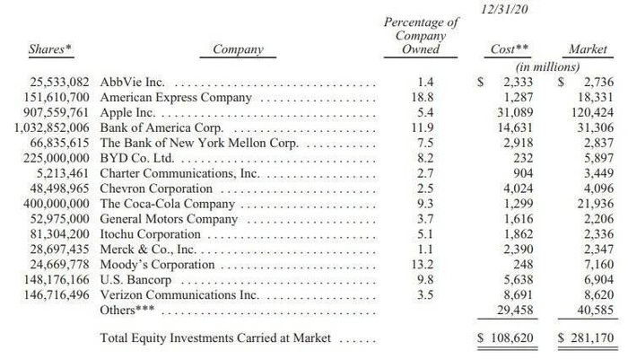 下面我们列出了15笔年底市值最大的普通股投资。我们排除了卡夫亨氏的持股——325,442,152股——因为伯克希尔是一个控股集团的一部分,因此必须使用“权益”法来计算这笔投资。在伯克希尔的资产负债表上,卡夫亨氏持有的卡夫亨氏资产按公认会计准则计算为133亿美元,这一数字代表伯克希尔在2020年12月31日经审计的卡夫亨氏资产净值中所占的份额。但请注意,2020年12月31日我们这些股票的市值只有113亿美元。