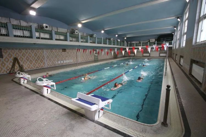 移步楼内,位于底层的室内游泳池是上海最早建造的温水池之一。池内原有两个沙滤设备,循环打水,后来改用泡沫籽过滤,保持池水清澈见底。
