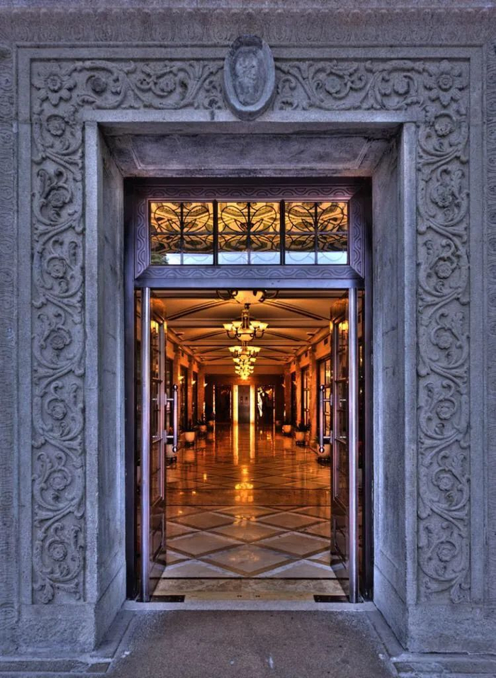 大厦门口竖立着两米多高的金属灯柱,柱面和柱基上雕刻着植物图案的精致浮雕,灯柱下有4个小狮头,栩栩如生。一条穹形长窗直贯于二、三层间,宛如一道彩虹。