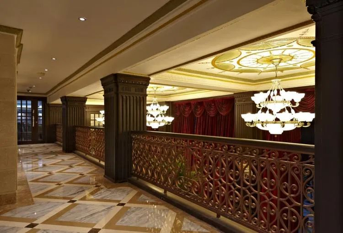 大厦的二、三层装修精美,墙面是大理石,上面镌刻着精致的图案和花饰,明亮的砖墙内饰让步入其中的人们感到强烈的华丽之气。四层以上,墙面呈直线凸凹状,左右各凸出四柱,凹进窗户,窗下的花饰用色淡雅,给大厦注入一股清风。