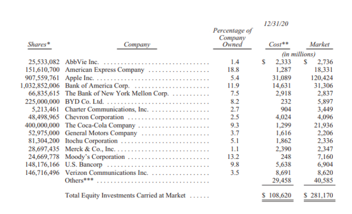 下面我们列出了15笔年底市值最大的普通股投资。我们没有包括卡夫亨氏的持股325, 442 , 152股,因为伯克希尔是控制集团的一部分,因此必须使用“权益“法核算该投资。在资产负债表上,伯克希尔哈撒韦持有的卡夫亨氏的现金价值为133亿美元,相当于2020年12月31日卡夫亨氏(Kraft Heinz)经审计的净资产中伯克希尔哈撒韦的份额。不过,请注意,我们这些股票在该日的市值只有113亿美元。