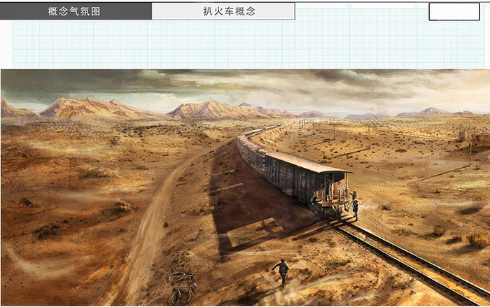 比如场景。美术指导王竞记得,起初自己想要设计和创新,在一望无际的戈壁滩上找一条孤零零的铁路伸向远方。他心中的美术风格参考是电影《疯狂的麦克斯》,体现自然环境和人对抗的残酷感。