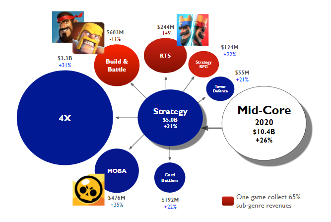 SLG游戏包含7个子分类,2020年SLG品类的总净收入达到了50亿美元(约合人民币322.5亿元),游戏内购收入同比增长了21%、下载量同比增长了9%。这也使得SLG成为移动平台(不包括亚洲的几个核心市场)的第二大品类,仅次于消除。整个中度游戏的大分类下,SLG收入更是占到了近一半。