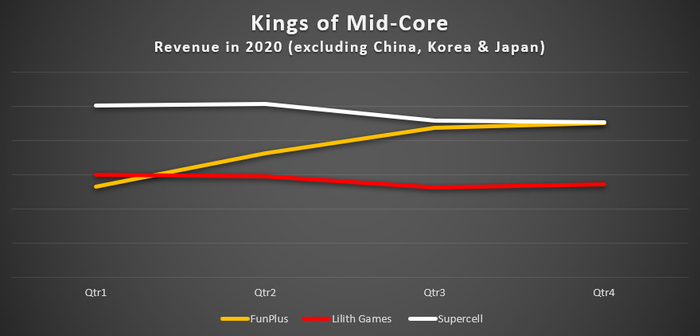 排除中国市场之后的部分,Supercell和莉莉丝的收入曲线更稳固,FunPlus也表现出了同样可观的增长