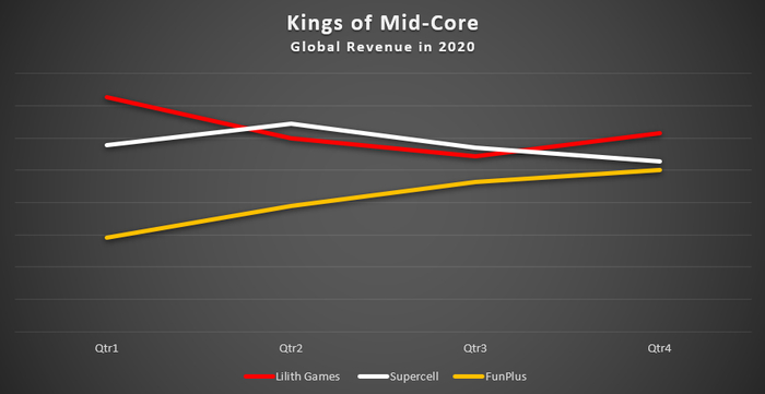 再看全球范围的收入,在市场不乏泡沫的2020年,Supercell和莉莉丝,都呈现出了一些下降的走势,FunPlus则维持住了收益曲线。