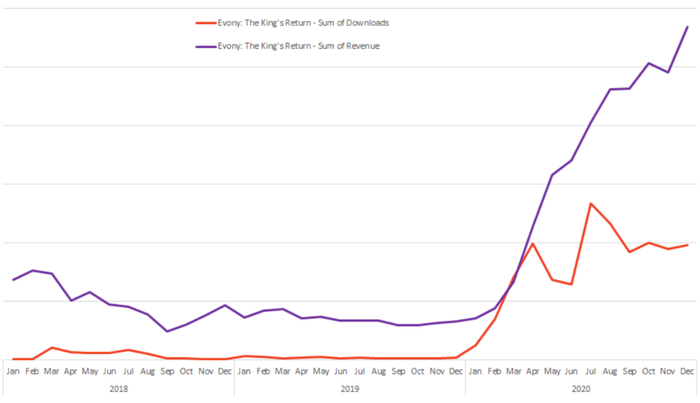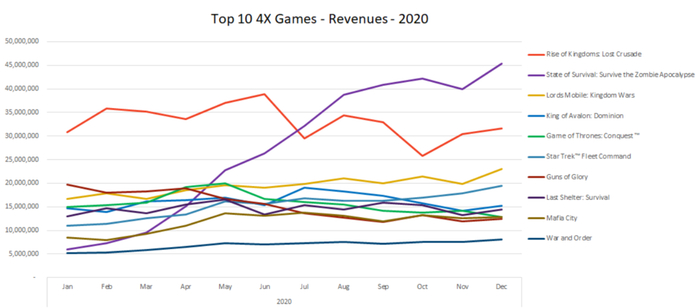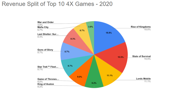 FunPlus的《State of Survival》是2020年的一大爆款,IGG的《Lords Mobile》和Scopely的《星际迷航》都经历了良好的增长。莉莉丝的《万国觉醒》在欧美市场达到了天花板水平,但考虑到游戏在亚洲主要市场的3亿美元净收入没有被算进全球收入中,这应该是目前4X游戏中规模最大的一款。