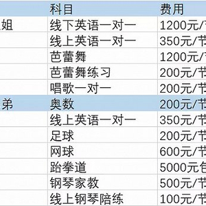 姐姐非常喜欢跳芭蕾,一周有2次1200元/小时的课程,还有5次200元/小时的练习课程,有时候参加比赛需要连续多天特训,单次也是1200元,她在芭蕾舞上一年的花费有16万左右。最近又报了一个一对一唱歌的寒假班,未来可能一周唱一到两次。上海好的老师都比较贵,当然也有便宜一点的课程和老师,我会帮她尽可能选最好的老师。
