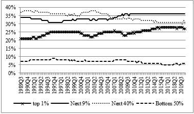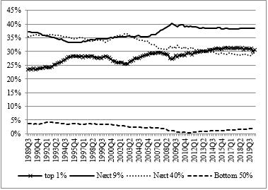 图1 1989年第三季度-2020年第二季度美国居民总财富占比变化情况