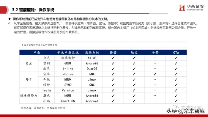 1)软件工程:包括操作系统、基础软件(虚拟化等)、智能基础 (用户画像、情景感知、多模态融合交互等)、应用开发 (Android为主)、仪表软件开发(QNX为主)、TBOX软件开发 (Linux)、云服务(信息安全等);
