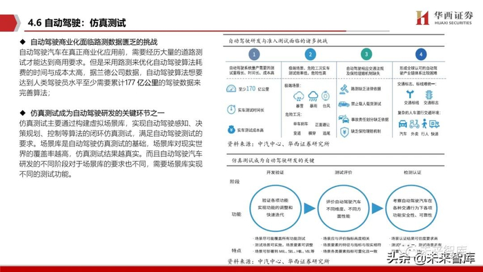 1)软件工程:包括操作系统、基础软件(基础库、分布式、核心服 务)、算法设计(定位、感知、规划等)、工程实现(FCW、LDW 等)、云服务(仿真、高精度地图),其中高精度地图已在前一章节 做了论述,本章不再赘述;