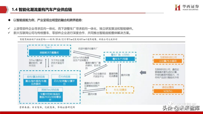 以智能座舱为例,产业呈现出明显的融合和跨界趋势:上游零部件企业寻求后向一体化,而下游整车厂寻求前向一体化,独立研发算法和智能硬件;新兴互联网公司与传统整车、零部件企业进行深度合作,共同推出智能座舱整体解决方案。