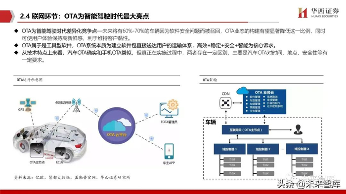 盈利结构对比:传统汽车主要依靠车辆及零部件等硬件销售获得收益,特斯拉则是由硬件销售+软件服务两部分构成,相 对于传统硬件收入的一次性确认&低毛利率特点,软件收入具有高持续性&高毛利率的“双高特征”(毛利率预计在70%-80% 以上,甚至更高),同时OTA技术变革带来的软件更新属性,可以显著改善驾驶体验,提高客户粘性。