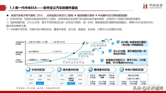 3)中央集中式阶段:车载中央计算机形成,覆盖车身域、动力域、底盘域、安全域,计算芯片出现整合态势。