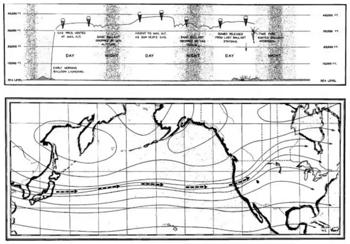 日本在第二次世界大战末期间曾利用这些高空风发射了数千个绑着炸弹的氢气球,企图轰炸美国本土。按照计划,气球炸弹升空后,必须一直保持在10058米的高度。因为只有这个高度,才能借助东去的气流。荒川秀俊设计了一种由高度计驱动的自动控制系统,用于丢弃压载物或排放氢气。当气球高度低于10058米时,沙袋就会自动脱落,使气球升高;当气球高度高于10058米时,气球气囊的阀门便会自动排出氢气,使高度下降。
