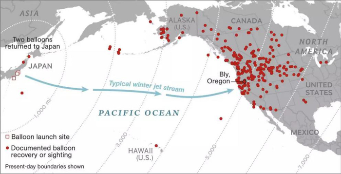 在对高空气流一系列的观测实验中,荒川秀俊观察到气象气球在到达约万米高空处,会进入一个风速极快的区域。气象气球在此区域内能够以高达300公里每小时的速度飞行,只需3天左右时间就能到达美国本土。