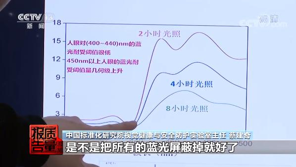 中国标准化研究院视觉健康与安全防护实验室主任 蔡建奇:该防的地方我们一定要防,不该防的地方是不能防的。是不是把所有的蓝光屏蔽掉就好了,事实上我们认为这并不是一个很好的方案,因为当所有蓝光都被屏蔽掉的话,第一可能会影响生理节律的问题,第二这样的产品尤其是一些比较严重的情况的话,会造成镜片出现很黄的颜色,这种很黄的颜色通过视功能试验发现视疲劳反倒会增加,这样的话我们是不建议的。