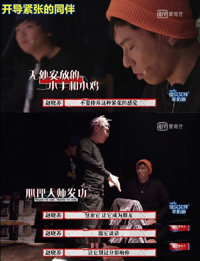 挺恰如其分吧,优秀!(这里是表扬自己)我不会说那种话,“你别紧张放轻松”,没用,那样说其实是伤害他。当你紧张得不行的时候,过来个人跟你说别紧张放松……你能放松吗?对吧?所以我跟他说,我有一招,这么做,就能让自己不太紧张。那时候他脆弱,恨不得毛碰到他身上他都得跳开,所以我会放慢点儿语速,也不盯着他说这事,一边干我的,一边拿衣服挂上椅背,一个声音在他旁边慢慢出来,不会让他感觉到我在给你灌输,还能帮着他一下,我就选择了这个方式。