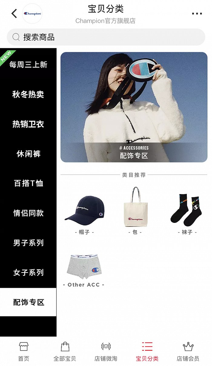 界面时尚在Champion天猫官网看到,品牌目前所售配饰产品有包袋、袜子、帽子,还未涉及鞋类商品。通过此次授权百丽国际,Champion中国市场专供鞋款将在百丽国际代理经营的零售网络和电商平台进行销售。