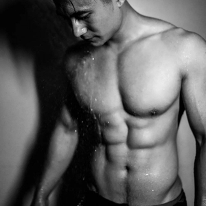 原图的拍摄背景是一面纯色的墙,一束光打在模特身上,参差的影子投射下来。照片中的模特是一位身材硬朗的外国帅哥,湿发,上身裸着,有一种禁欲式的性感。
