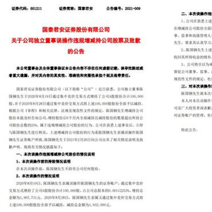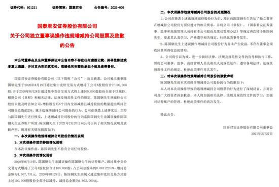 2月27日,国泰君安发布了一则《关于公司独立董事误操作违规增减持公司股票及致歉的公告》。