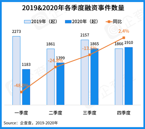 从融资事件数量来看,企查查数据显示,2020年我国共发生6357起融资事件,同比下降22.1%。其中一季度共产生融资事件1183起,同比下降48%,二三季度分别同比下降24.8%、13.5%,下降幅度逐季缩小。四季度实现了正增长,当季产生融资事件1910起,同比上升2.4%。