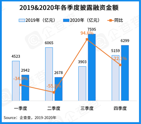 从融资金额来看,企查查数据显示,2020年全年共披露融资金额19515亿元,同比下降0.7%。其中,一二季度融资金额分别为2942亿、2678亿,均呈同比下降趋势。三季度猛增至7595亿,同比大涨94.6%,四季度数据为6299亿,同比增长22.1%。