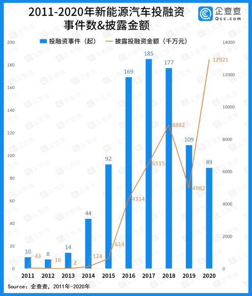从年销量不足万辆到突破百万辆,我国新能源汽车产业正向中高级阶段发展,也日渐成为引爆资本市场的热门概念。企查查数据显示,2020年新能源汽车品牌披露融资事件数比去年下降了18.3%,但披露的融资金额同比大涨159.4%,达到1292.1亿元,近十年来首次突破千亿。