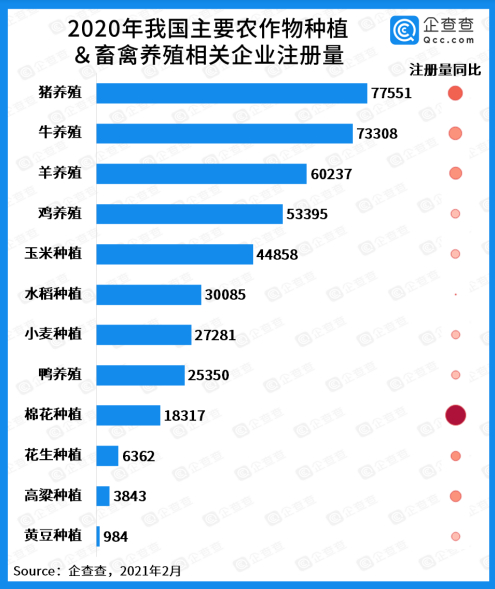 从2020年我国主要农作物种植与畜禽养殖相关企业注册量分布来看,除了水稻种植呈现同比下降趋势外,其他都呈现同比增长。