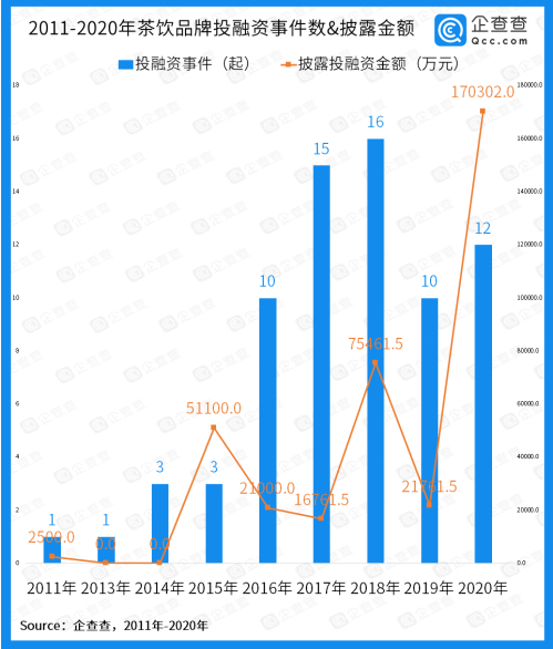 近年来,奶茶已逐渐成为年轻一族生活中必不可少的饮品,各具特色的茶饮品牌层出不穷,吸引着消费者趋之若鹜的同时,也大受资本市场的垂青。企查查数据显示,2020年茶饮品牌共发生融资事件11起,与2019年基本持平,不过披露金额达到10.4亿元,同比大涨378.6%。