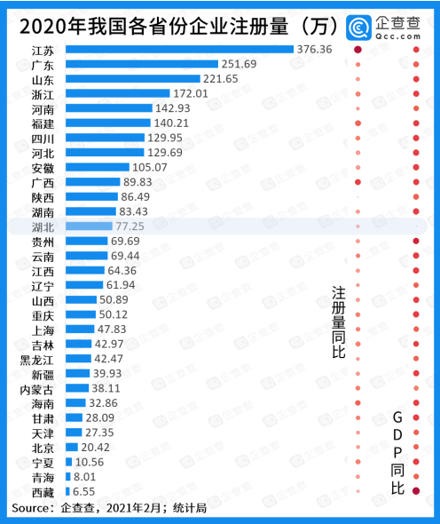 对比31个省市近期陆续公布的GDP增速来看,湖北作为唯一一个GDP增长率为负的省份,在企业的注册量方面也同样呈现下降趋势,2020年全省共新注册企业77.25万家,同比下降11.0%。而在湖北之后,注册量下降率同样大于10%的省份,还有陕西、西藏、辽宁与河南。