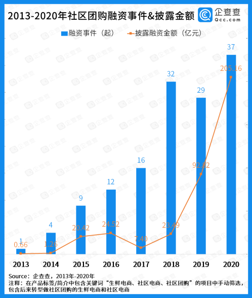 2020年,社区团购一举成为互联网巨头争相布局的新战场,并且更是在下半年成为舆论热议的焦点。企查查数据显示,2020年社区团购公开融资事件达37起,总披露融资金额高达205.16亿元,同比猛增121%,两项数据均创下历史新高。