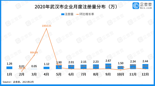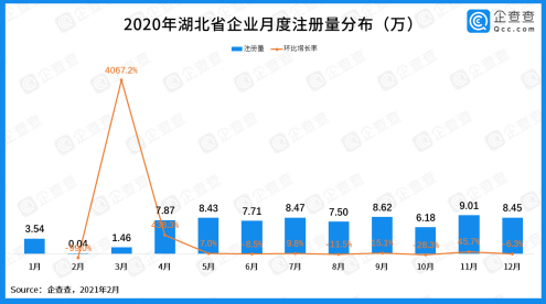 企查查数据显示,湖北省企业注册量在2月份跌至351家的冰点,环比下降99.0%,随后在3月份立即反弹至1.46万家,环比上涨4067.2%,4月份新增企业7.87万家,环比增长438.3%,随后5-12月份大体呈现环比增长与下降交替波动的走势。
